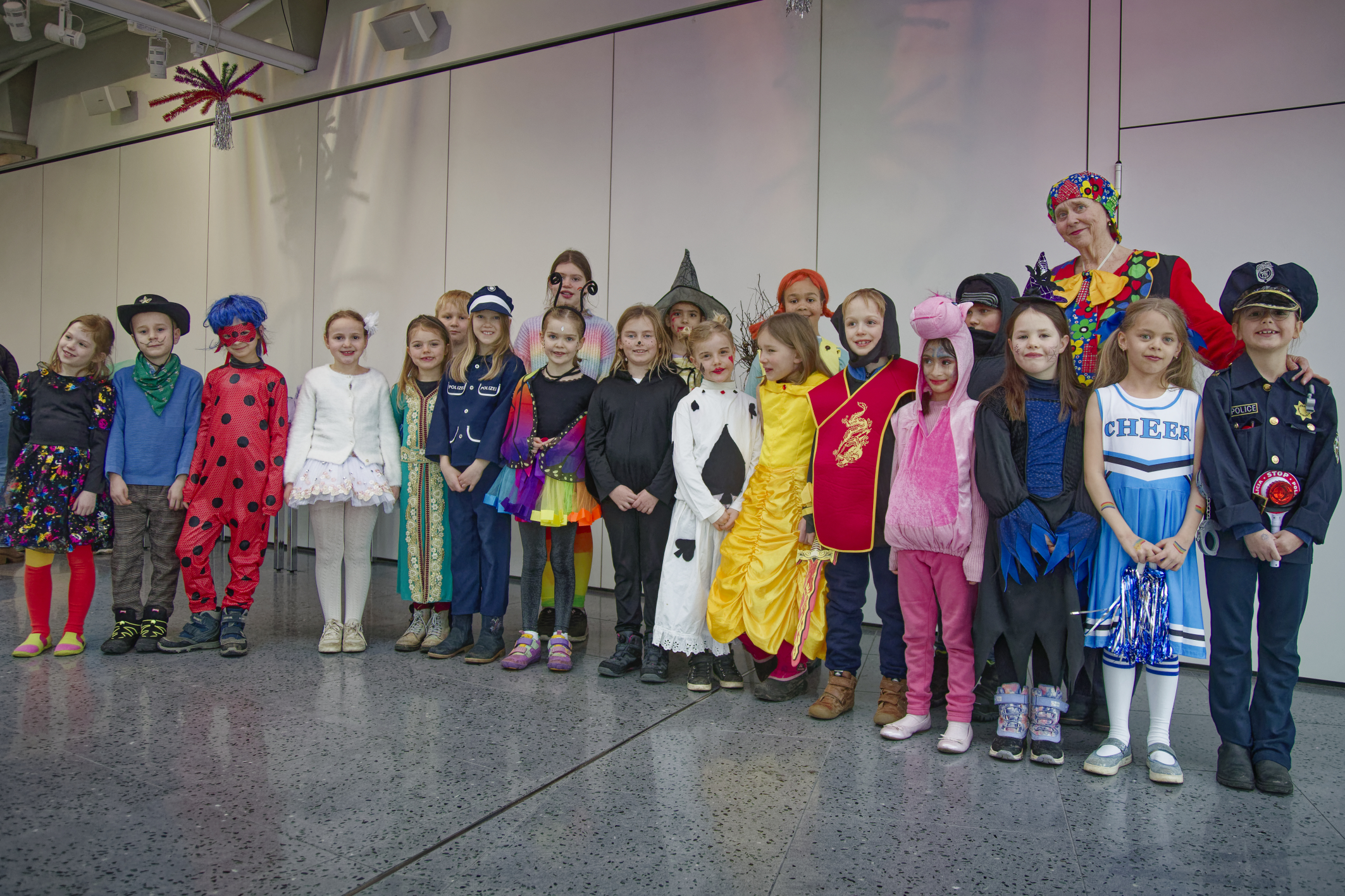 Auf der Bühne des Bürgerhauses präsentierten Kinderchor, Schulchor AG, Europäisch-Ukrainische Schulchor AG und zahlreiche kleine Klavier-, Flöten, und Geigenschülerinnen und-Schüler, alle in originellen Masken, lustig-launische Beiträge zum Zuhören und Mitmachen.